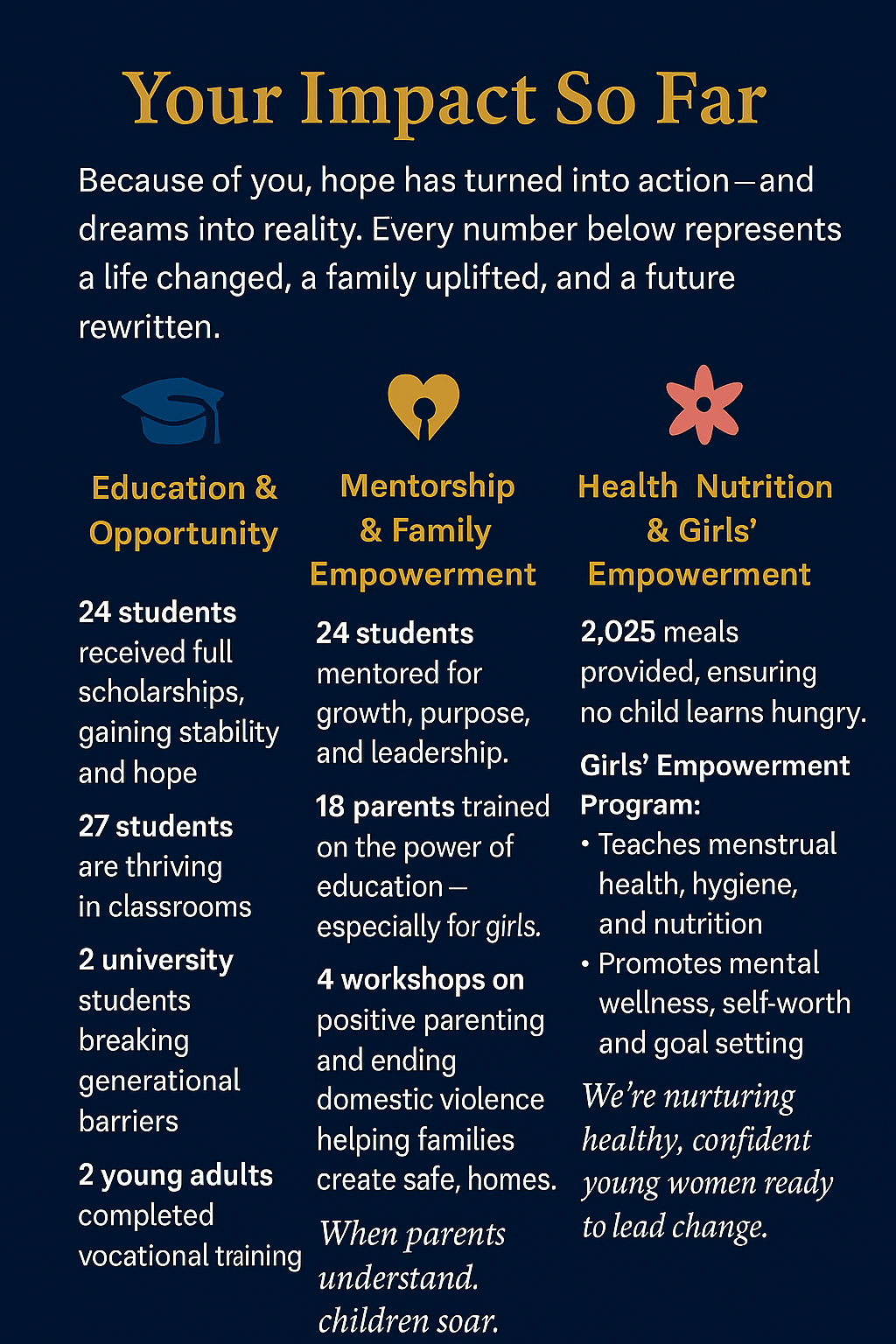 Full and Partial Scholarships: We empower futures beyond academics. Our scholarships, from full to partial funding, support children, youth, and young mothers pursuing certifications or vocational training, equipping them for the skills and knowledge they need to thrive.